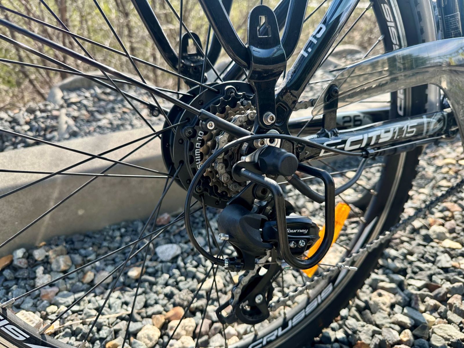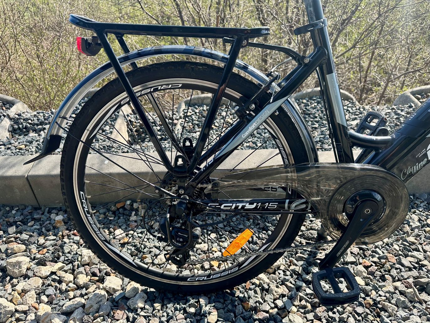 Crussis e-City 1.15 disponuje hliníkovým rámem s pohodlnou geometrií. Hlavní rámová trubka je posazena velmi nízko a vy tak můžete na e-kolo nasednout bez sebemenších problémů. Rovněž sesednutí je díky geometrii elektrokola rychlé a bezpečné. Elektrokolo je tak vhodné také pro ty, kterým může klasická geometrie elektrokola činit potíže třeba ze zdravotních důvodů. Již žádné namáhavé nasedání na kolo!